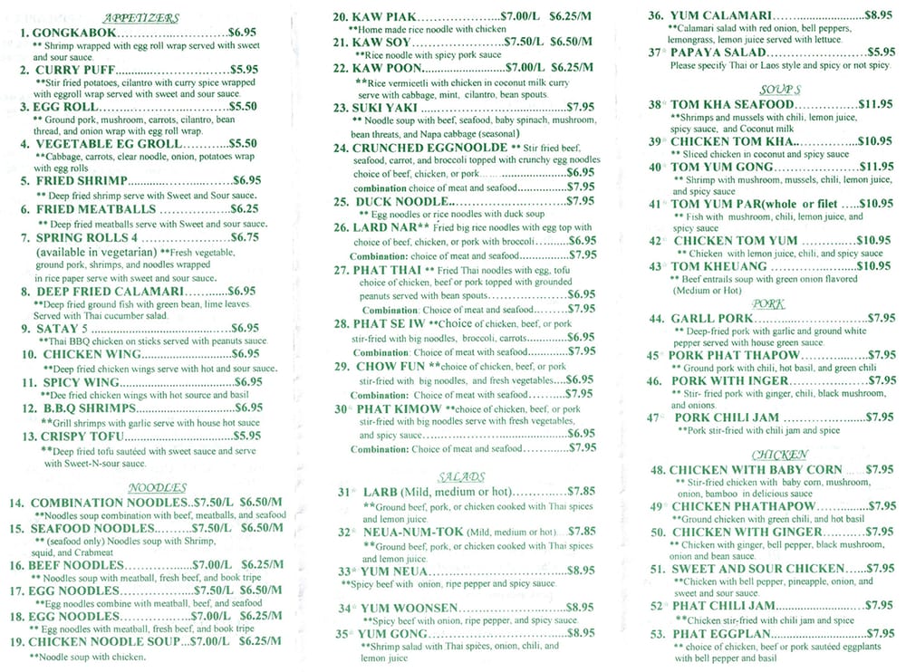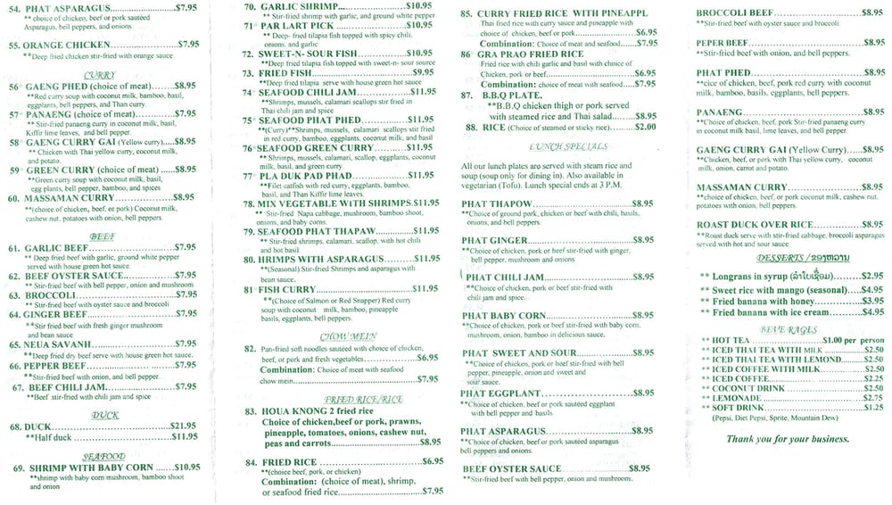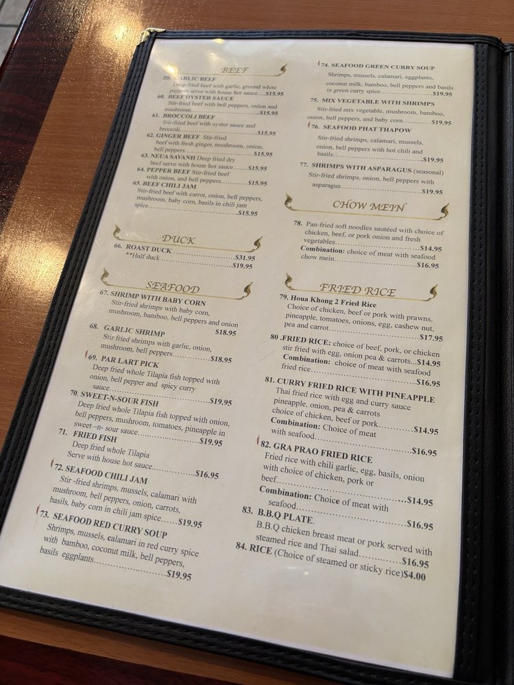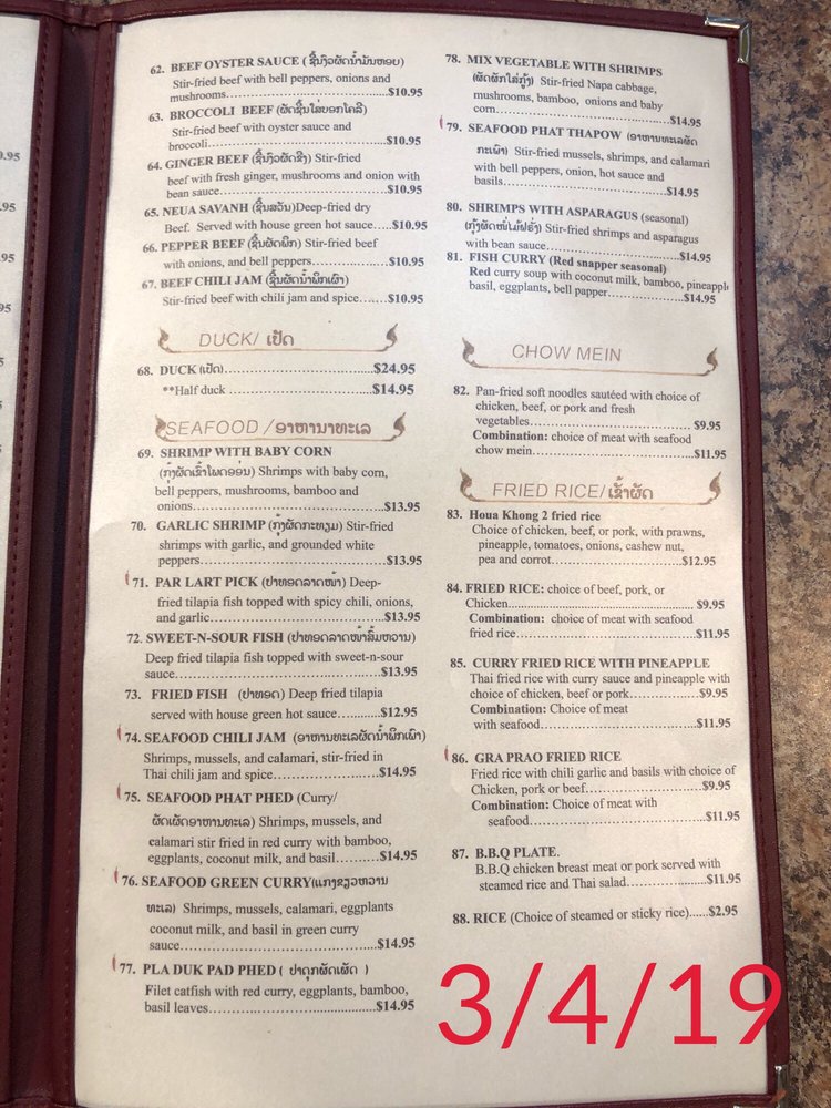 Nestled in Merced, CA, Houa Khong 2 offers a delightful escape into the vibrant world of Thai cuisine. This casual eatery caters to all, from families to vegan diners, with an extensive menu that highlights a variety of flavors. Notable appetizers like the crispy spring rolls and savory curry puffs set a delicious tone for your meal. Signature dishes such as the acclaimed Pad Thai and Tom Kha Seafood showcase the chef's skill in balancing authentic spices and fresh ingredients.
